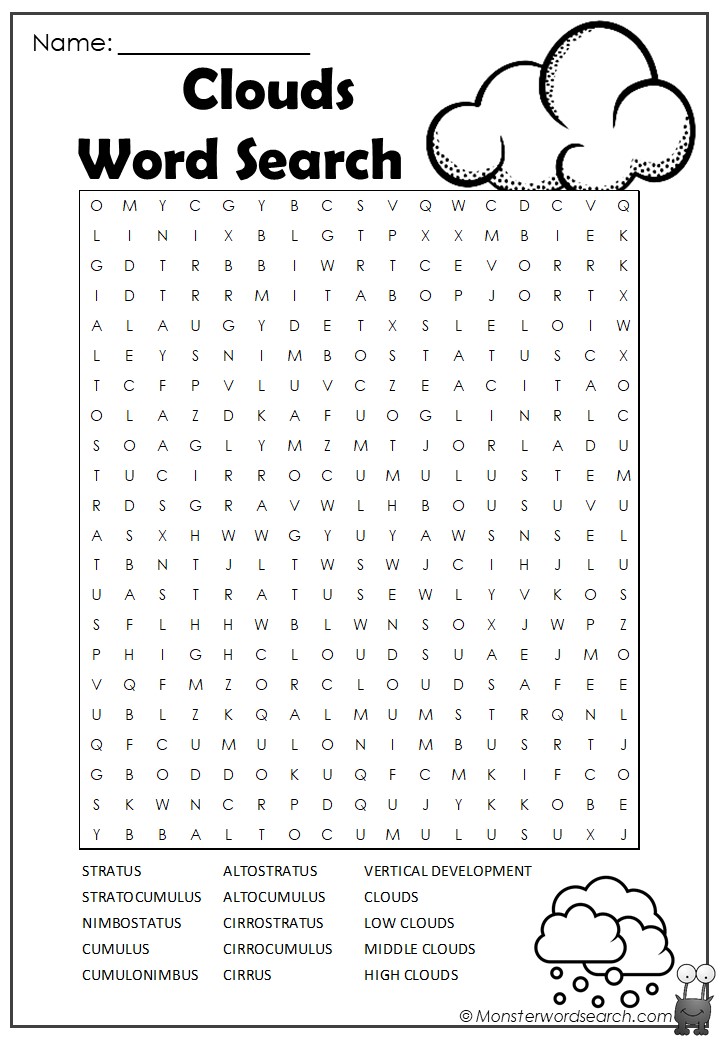 Observe and learn about the different cloud types in the sky, and do a fun word search! We can think about different weather we’ve experienced, and then create a diagram showing the cloud types. Created By Lauren Theis, Director of Education