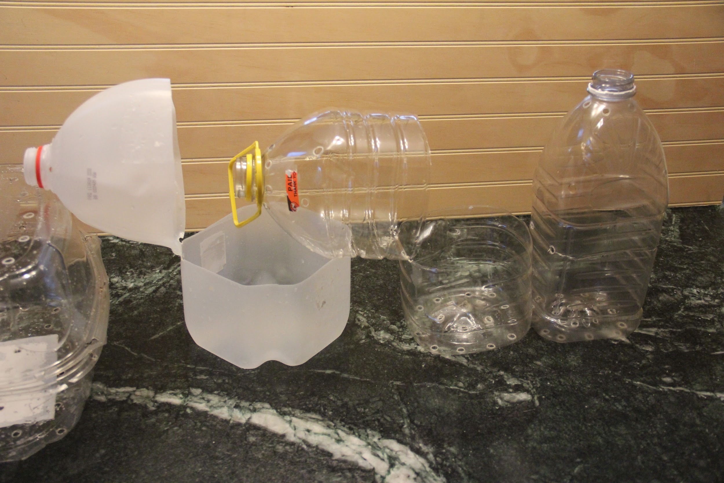 - Using a drill, awl or the hot end of a glue gun add holes for drainage and air. Add some extra vent holes around the collar of the jugs and plenty of vent hole to the top of flat salad containers. Add holes in the bottom for drainage. See examples in the pictures provided. Note: To aid in cutting the containers in half, you may add two holes at least an inch apart under the jug handles or the shorter side of other containers. This makes it easier to start to cut in half then jabbing the end of the scissors in to the container.